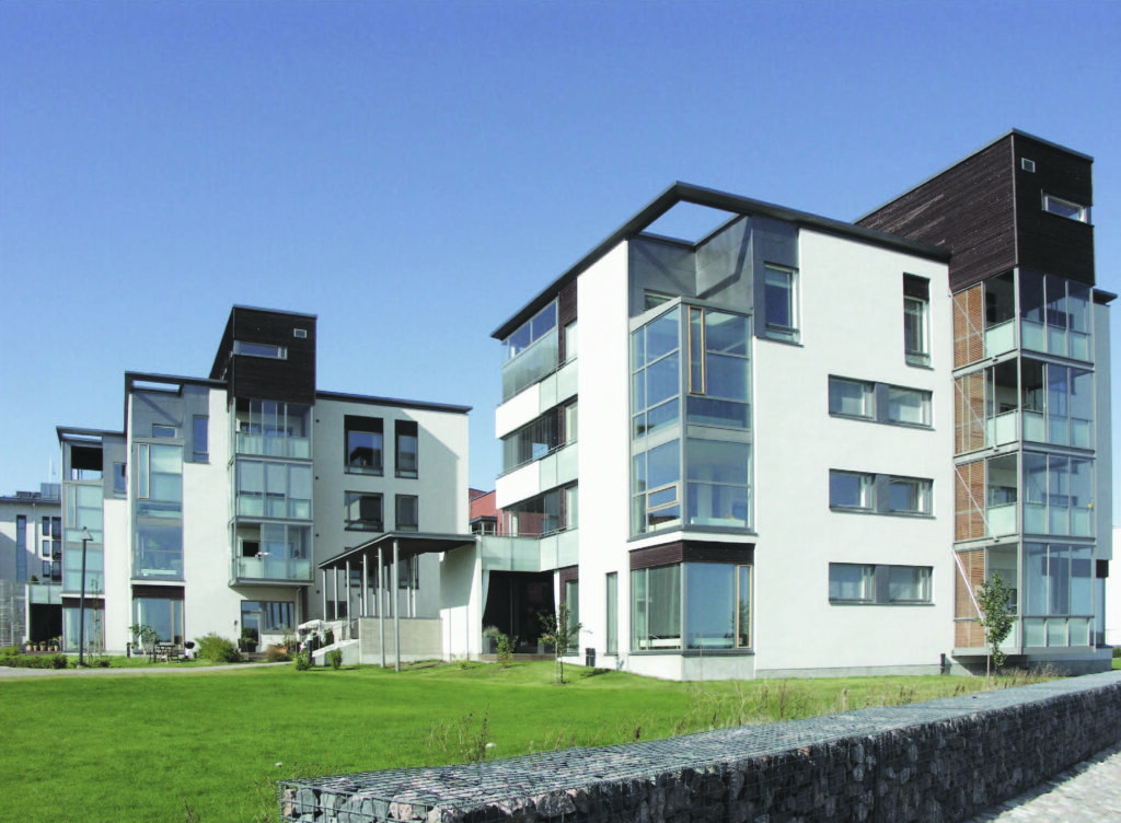 Kolme asuinrakennusta meren rannassa. Asunnot vaihtelevat kerroksittain.